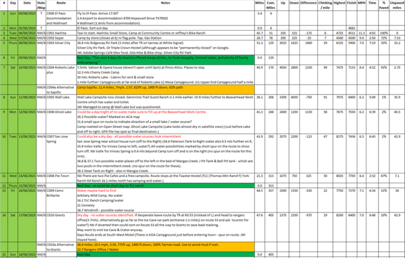 Below is an extract from my planning. I tried to take into account the climbing, road surfaces, the suitable places to stop, water and re-supply points. I avoided sleeping at the highest points to help us acclimatise to the altitude. The speeds and times were what Kamoot predicted. Although not accurate they did give us a guide to the relative difficulty of a particular day.
