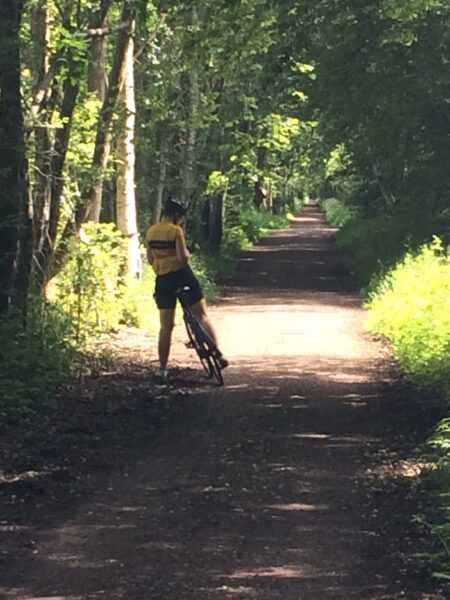 The front wheel fell in and jammed in the slot stopping the bike dead. We were all very worried that Gavin may be concussed and took a few minutes to take stock. Although dazed and shocked Gavin appeared to be ok and joked that he was glad he hadn’t bought the cycle helmet he’d looked at in Forest Row as he would have scratched it!