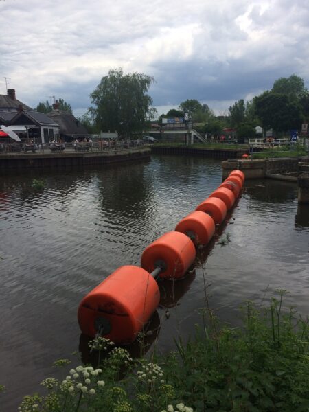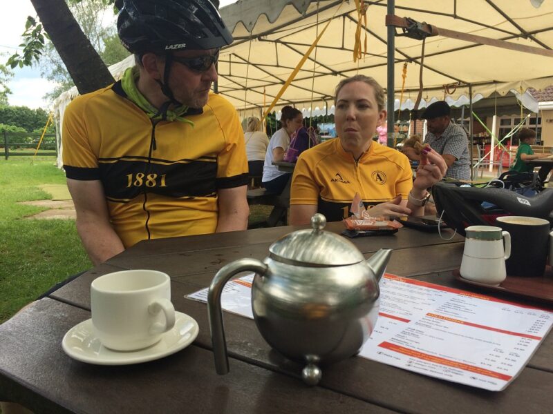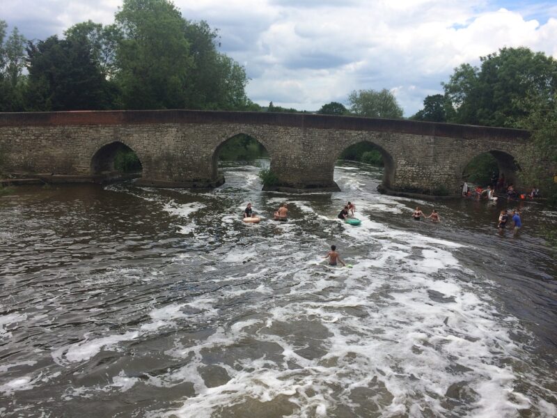 The River flows through northern Tonbridge but we cut through the middle of town. The cycling was a bit easier on the flatter terrain around East Peckham and it was not long until we reach Tea Pot Island, Yalding, right on the Medway. After nearly 60 miles we were ready for a lunch break. The River had grown. It’s large enough to support boats, locks and weirs at this point.