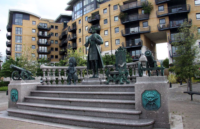 “Peter the Great – Russian Czar. Peter the Great, arrived in England in January 1698 and stayed in Sir John Evelyn’s house, Sayes Court in Deptford for four months. This monument is erected near the royal shipyard where Peter the Great studied the English science of shipbuilding. The monument is a gift from the Russian people and commemorates the visit of Peter the Great to this country in search of knowledge and experience”.