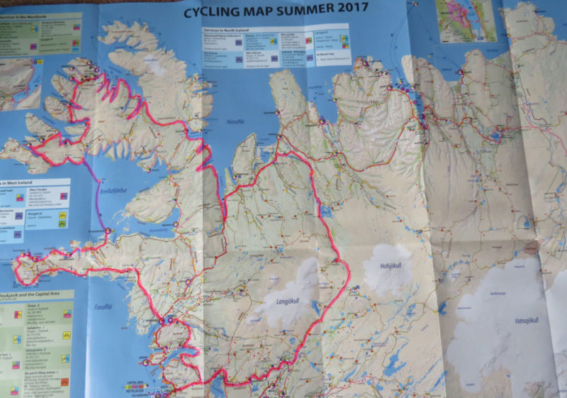 Our route in pink. We went anti-clockwise, up through the middle first then through the Westfjords and back via the Southwest Peninsular – a total of 872 miles. This is the new Iceland Cycling map that the majority of cyclists we met relied on and which shows shops (there are only a few), cafes as well as campsites and cycle enthusiasts who will help with broken bikes. We also had more detailed maps with us.