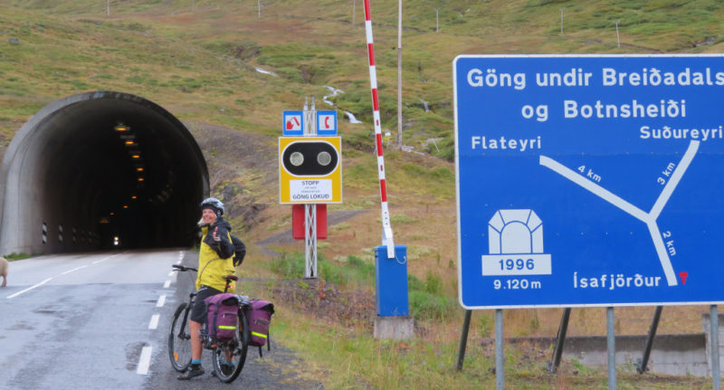 A 6km tunnel awaited us after Isafjordur and I was nervous about going through. It was an odd tunnel with a junction in the middle and one half single file and I woke Tim up early so we could go through before the few cars we saw each day arrived. We were on the road by 7.30 but it was fine – big and airy there was no fumes and plenty of passing spaces along the single file section.