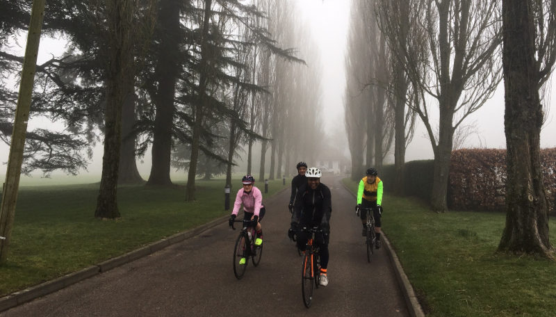 Four of us at the start, Bob, Jason, new rider Asif and Pete, with Karen joining us at Coulsdon PO. It was a gloomy but dry morning as we set off up Portnalls Road and then onto Gatton Park where, for a change, we took a diversion through the Royal Alexander and Albert School which was very quiet and the early morning mist provided a scenic backdrop.