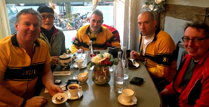 Our route took us up Old Lodge Lane and then cutting through on tracks up hill to the Fox at Old Coulsdon, then along behind the barracks and up to the North Downs way. This is a lovely route with great views down onto Reigate. It made a change going down Shepherd’s hill where we then picked up another track which joined up with Church Lane into Bletchingly for tea stop at Lamington’s