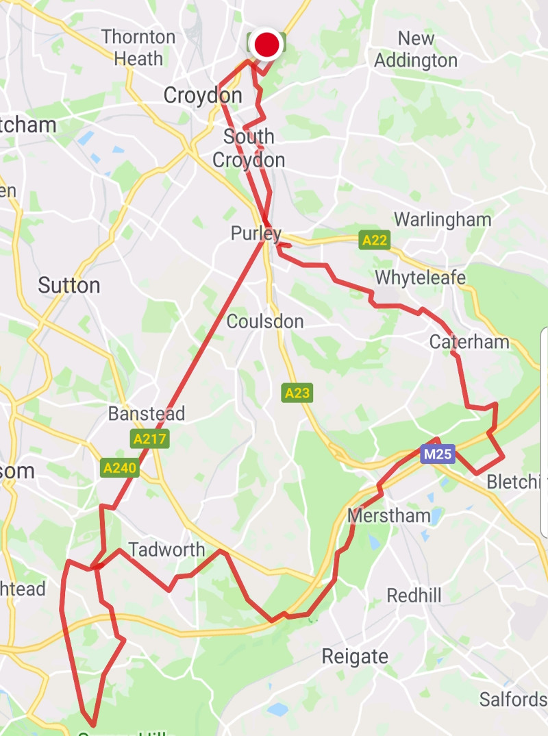 Then it was across Walton Heath, Banstead common, past the Sportsman pub at Mogador and onto the North Downs Way. After that it was through Gatton Park, Merstham and onto more trails past Hawthorn school and finally up Hextalls lane and War Coppice road.