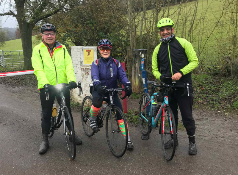 Karen and Asif were waiting at Shurgard, both suitably attired for the wet weather and Karen sporting a rather striking pair of socks which were not only super highly visible on the road but also just the ticket for the golf club destination.  Mick was running a bit late due to some wardrobe issues but joined us at the bottom of Old Lodge Lane wearing about 6 layers.  This did lead to some overheating later and maybe the lesson is that if you can’t decide what to wear then wearing everything is not the answer.