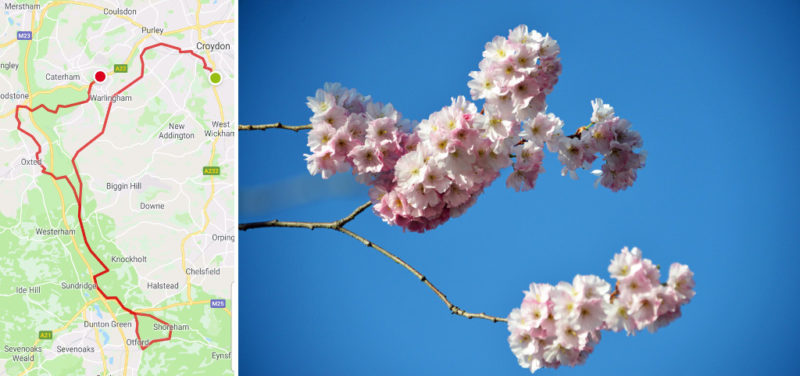 Pete bailed out at Oxted with knee pain and took the train home which left him time to take some arty farty cherry blossom pics before meeting Roger at the Watt for a post ride beer. Miles veered off towards Clarkes lane, Vince was also under some time pressure so caught the train to Croydon from Whyteleaf. Graham and Roger completed the route.
