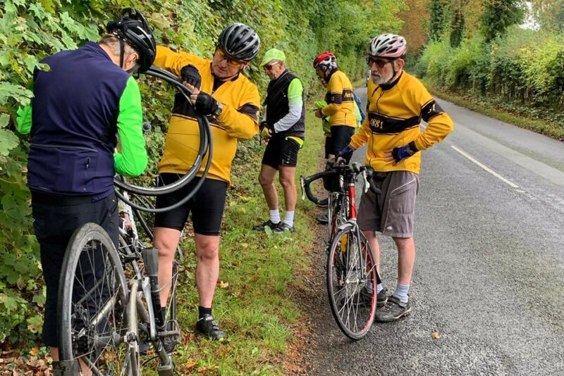 Graham joined us at Chaldon and we’d not gone far along Springbottom Lane when Bob had a visit from the puncture fairy which turned out to be a very small but sharp piece of flint. It was quickly fixed and we set off once again via Bletchingly, towards the windmill at Outwood. We passed a sign saying Police Slow and it was there for good reason – very slippery mud spread across the road for at least half a mile. Fortunately the warning help us avoid some nasty spills but bikes, shoes and kit were splattered.