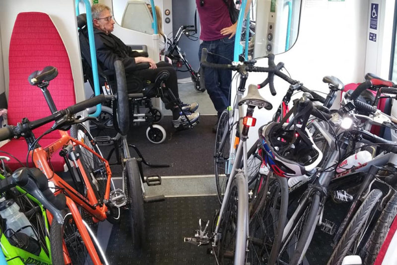 Once at the coast we rode to Brighton arriving on schedule soon after 5 pm, so expected to be back at Croydon for 6 o’clock. Rail engineering works however meant serious delays and a route along the coast to Littlehampton to pick up another line to London. The bus replacement services wouldn’t take bikes so we had to squeeze many bikes into very limited space. Fortunately everybody, including disabled passengers and train staff, were practical and accommodating.
