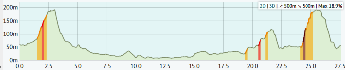 Hardly having taken this photo, the heavens opened and we had to sprint back to Sue’s parked car. And so the rest of our tour was cut short before we were able to climb the Iast hill of the intended first day’s bike ride. But below is the route profile.