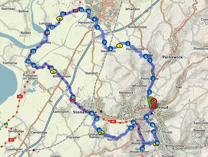 Heading north took us up a wooded B road, climbing from the valley of the Painswick river and up to the number 4 on the above map. Here just visible is the name of the hamlet, Edge. It literally is on the edge of the ridge top escarpment, overlooking Painswick. Here we hit our first problem. The intended route, following a very steep descent from the ridge, down a car width narrow lane, was blocked by a “Road Closed” sign. So we headed back to the B road and followed it into Gloucester. Here again our route was barred. This time by a bevy of police vehicles.