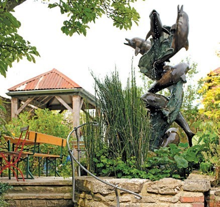 We were very lucky to get a just vacated table on the lower terrace, and with more miles and more hills yet to go, we just had a light lunch of fresh bread and delicious home made soup. Then it was time to relax and enjoy the tinkle of water from the sculptured fountain of several entwined dolphins.