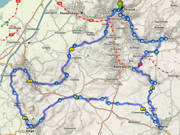 And this was our circuit to Tetbury (at number 22, bottom right hand corner) and back to Stroud.