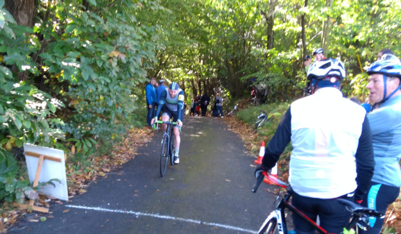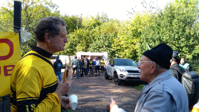 We started with five but lost one to a non-cycling fairy visit before Warlingham. Four arrived at the Catford Classic Climb of York Hill. Cheap tea, baguettes and a super friendly atmosphere pervaded. Here John E listens to the history of the climb with Keith H of Catford CC and still very much active.