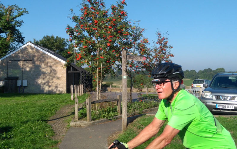 Relaxing hidden behind the pub we were more than a little surprised when Frank suddenly appeared. Apparently he had been set out late and interrogated almost everybody en route about a mysterious bunch of golden clad riders. Finally The Griifin landlord gave away our position so now five we headed south.
