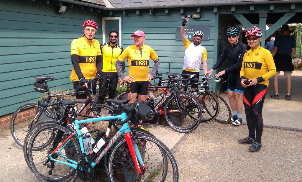 The weather and views were astounding and we cruised at what felt like 20mph towards Reigate and up the A23. At Merstham we were joined by Des’ mob and this picture was taken at the top of the hill where we stopped for a gossip before finding our individual ways home.