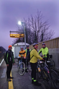 After a cup of tea and a slab of cake the weather cheered up and we headed off through Capel, Ockley down Weare Street to Oakwood Hill and Rudgwick. At Loxwood, Pete declared himself to be feeling deflated so we stopped for another long break. Fortunately there was a puddle nearby so Pete identified the hole and Dave found the piece of gravel in his tyre. Great teamwork displayed here. By the time we hit Wisborough Green I was hearing rumblings of “I’m hungry”. However, I ignored them as the prospect of getting to Amberley in the dark did not appeal despite Julia’s powerful searchlight mounted on the handlebar.