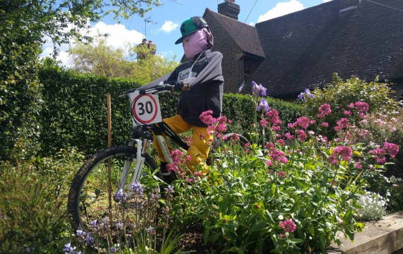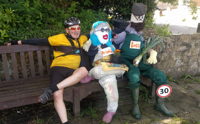 8am saw eight starters for an extended ride. The early rain shower ended as we started for a day that was both sunny and warm. Up to Farthing Down for the photo shoot. Jeremy chased us up just short of Outwood and tea was taken at Tulley’s Farm. This looked to be a control centre for a motocycle event but we left before the rush. Jeremy turned home and we cycled down through Ardingly who were having a combined scarecrow festival and safer roads/walk to school week event.
