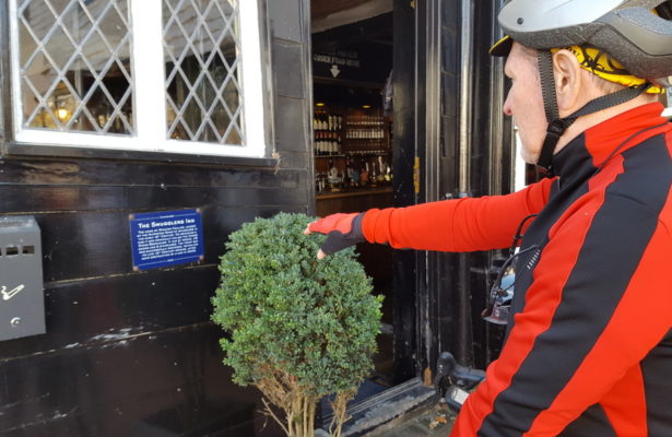 After 53 miles we ate lunch at the Smugglers Inn at Alfriston (slow service considering we mostly just had chips). The change of lunch venue brought on by Tomtom’s desire to see an old CTC wheel logo. It was a really decent place to sit in the sunlit garden while I ate my illicit sandwich. A traffic jam in Alfriston forced us to take a footpath across the river and fields onto the other side of the valley before we