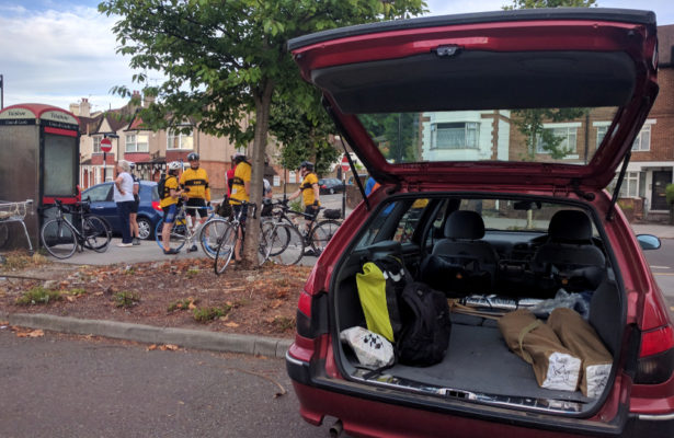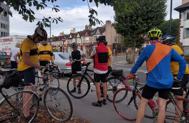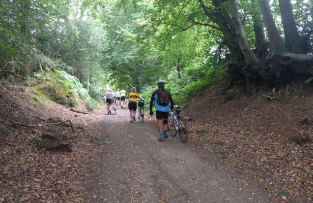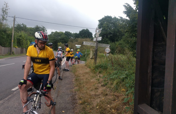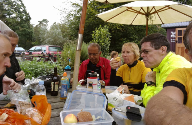 Meike was at the start to scoop up the assorted panniers and rucksacks to transport them to the Devil’s Punch Bowl at Hindhead. Jeremy had the route thoroughly Garminised and the forecast was fair.