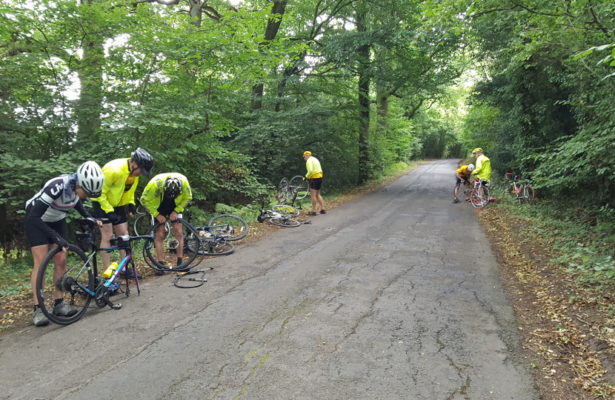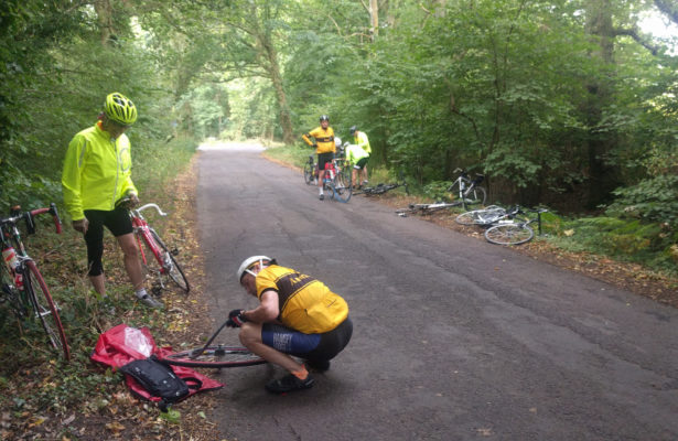 All but one elected to do the full monty return. Back down the gravelled path we sped. Except it wasn’t gravel – it was flint. Within a mile we had four fairy visits and our destination had ben renamed the Devil’s Puncture Bowl.