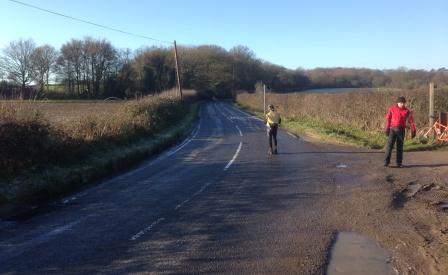We made our way to the A22 and rode the short stretch to the crossroads turning left into Miles Lane, IT WAS BACK ICE and after 100 yards I heard another shout and after pulling over to the grass looked round to see Yoshi and bike over the road with Austen 15 ft in front also on the floor. Thankfully the cars behind had stopped but I had to keep an eye out for cars coming in the other direction.