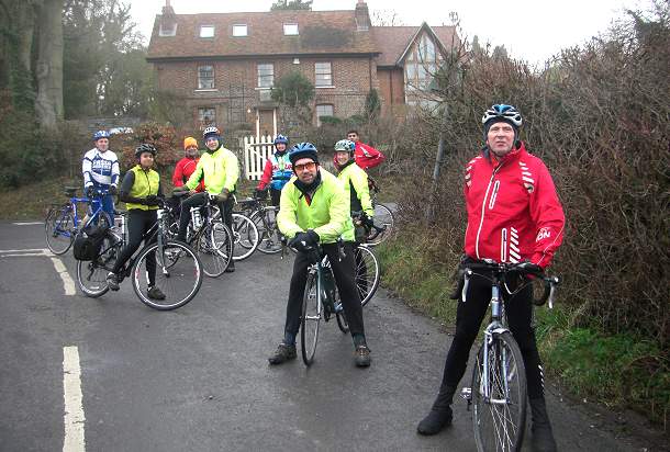 Chiily, not icy and dry. A chance to keep exercised in January and for Tom & Des their first training ride for their Santiago de Compostela expedition this summer. Gathering up Julia & Tom in Warlingham made us ten for the relatively short ride over the North Downs to Brasted and the ’96 Degrees’ tea room.