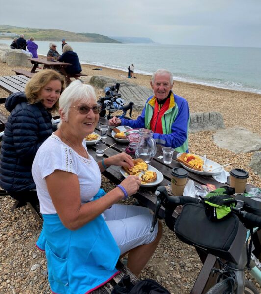 It was our second away day at Weymouth, and the 4 of us met up in the morning and set off on our bikes for breakfast at another sea front cafe, just up the road. This cafe, The Oasis, was just opening up but already there was a queue waiting to be served, including some other cyclists. This suggested that it was a popular cafe and likely to provide good breakfasts to start the day – which it did!