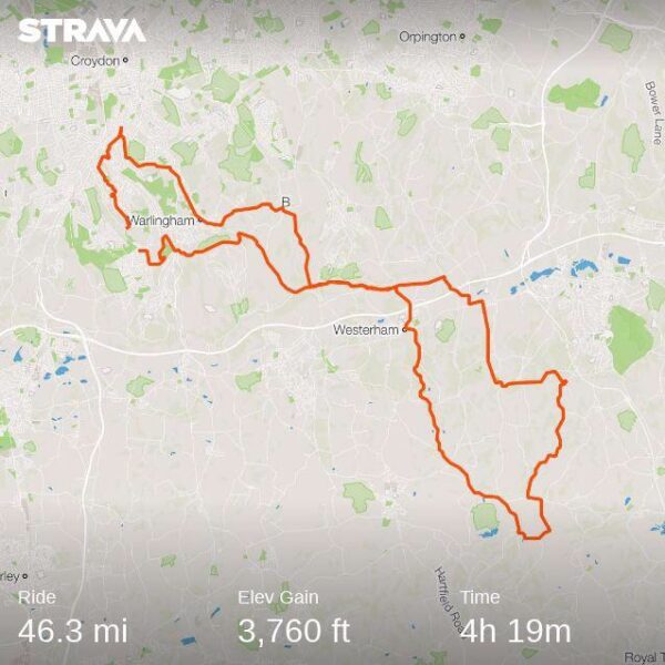 But soon we had to get back to tempo fugit, but with tired legs it was a bit less fugit! Especially the climb from Four Elms, up past Chartwell and finally up from Westerham to Botley Hill Farm and home. A total ride distance for me of just over 47 miles, and I don’t mind admitting that I was knackered!