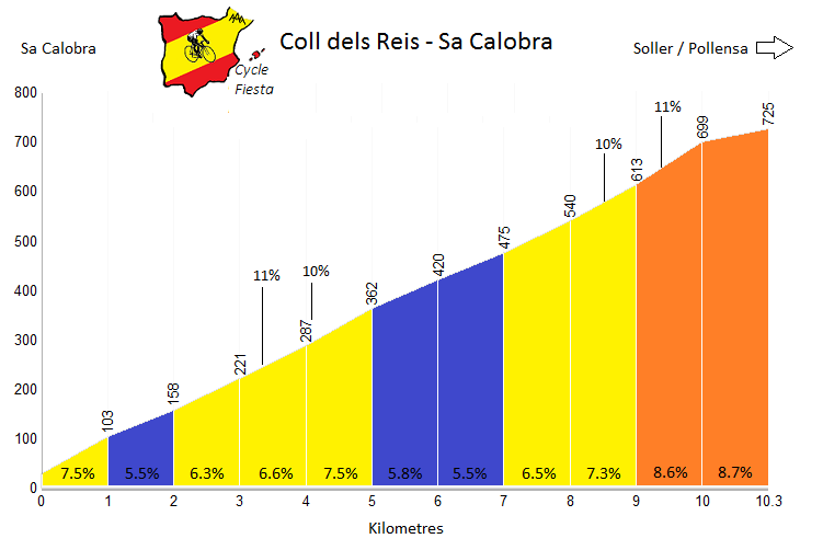 But the above is just part of this serpentine monster climb. First you have go down to the little bay at the bottom of the hill, and then climb back up from sea level. It is then all up for 10.3 k (6 miles). Although the statistics say the average gradient is “only” 6.5%, the numbers appear to tell a different story. As you can see from the profile below, there are sections where the the gradient increases to 10 and 11%. And if that is not enough, there is one short section where it hits 20%!