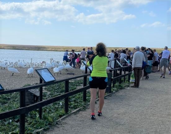 Note the gent ahead of Sue. The one wearing a baseball cap and holding a shopping bag. After the feeding, and a very interesting talk by the Swan Keepers had finished, an elderly lady came up to TomTom. Having seen his Anerley gilet, she asked if it was Anerley in south London. Having been told that it was, she informed us that her husband had been a member of our bike club in the 1950s. She then walked off, only to return with the gent in the baseball cap, who was introduced to us as Stan Hutson.