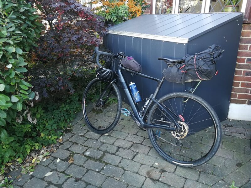- Packing – work out my other bikepacking bags to spread cargo efficiently; check the weather forecast to select correct clothes to take – warm jacket required; spare shoes not required; maybe take a fold up rucksack for temporary.