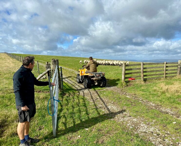 But as we were hiking, we continued on for the extra mile to a car park adjacent to the old drovers trail, which crosses the B road here. But the drovers are mechanised now so my son Paul helped to speed the flock on their way.