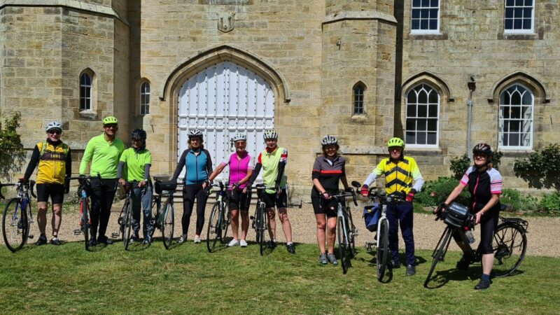 Sunday 8th May proved to be a record breaker in more ways than one. Blue sky, hot sun and a record breaking temperature for the hottest day of the year so far. And possibly a record breaking number of riders for this early in the year – the 9 below plus our photographer made it – eventually – to Chiddingstone Castle. And for those who like a challenge, we got caught up in an annual sportive, something that Anerley B.C riders might like to compete in next year – so read on for details!