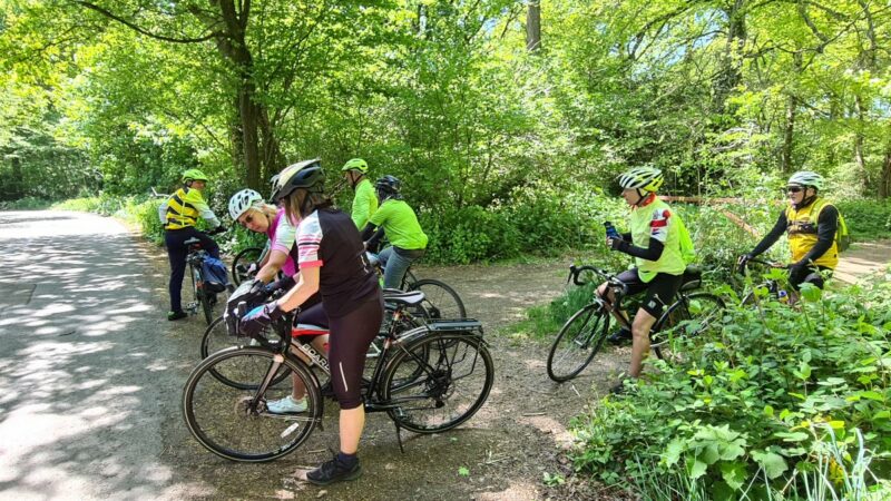 From Oxted we went over Limpsfield Chart (lots of good bridleways for our Gravel bike riders!) and down the fast descent of Paineshill, at the bottom of which Ewa hit a pot hole. This resulted in snake bite punctures to both front and back wheels. But how many does it take to fix a puncture – or two?