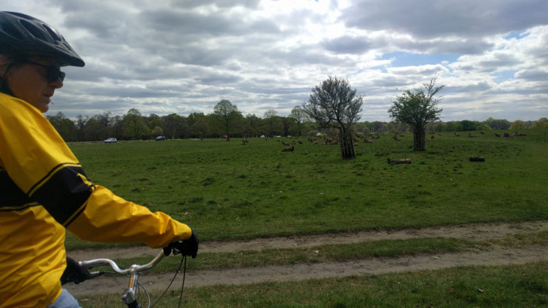 Over the road and out into Merton at the Savacentre, we picked the trail up again passed Merton bus garage and followed it until we reached an old mill over the river,we now rode on through Wimbledon and up into Wimbledon village,over the common looking for wombles,and under the A3 into Putney Common where we came out into Roehampton. Up the hill and turned left into Richmond Park where we stopped for lunch at the first cafe at Roehampton Gate.