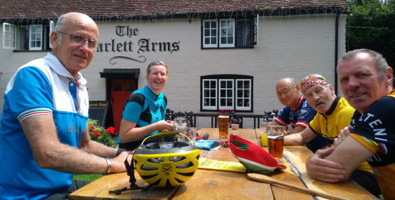 Then a thankful long and glorious descent to the Scarlet Arms at Walliswood where we could, at last, realx and enjoy the sun. Back via Reigate and the Merstham Gap. An enjoyable 54.37 miles @ 14.03 mph. (Yes we did drop below 20 mph on the ascents!)