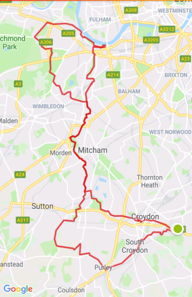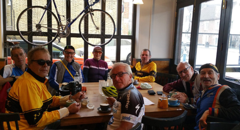 Nice easy flat ride, led by Mark, through various parks to Dynamo Cafe, Putney, SW15 2NA, 37 miles. The group picture of us outside was taken on the bridge over the River Wandle where it enters the River Thames.