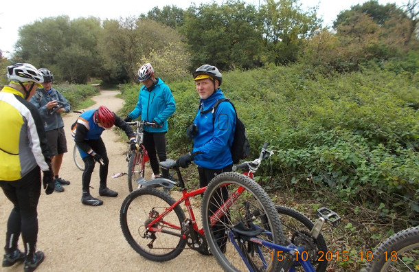 After crossing the road again we picked up a new part of the trail that bought us out at Plough Lane. Once on Plough Lane we rode up through Wimbledon Village and onto the common which is where Tom had an exploding front tyre. At this point we decided on a change of lunch stop so went to the Windmill CafĂ© on the common for lunch and to do a quick fix on Tom’s tyre. Barry patched up the tyre using plasic bags. After lunch we rode back into the village to get a new tyre for Tom’s bike after the shop gave Tom the wrong size tyre, we managed to fit the right size one after a while and carried on are way back down the trail the way we came. We stopped for coffee on the way back at Merton Abbey Mills once home to Liberty’s workshops, now home to a pub, craft shops,a pottery, and a number of good food shops. Once refreshed we set of back along the trail. We finished the ride in Beddington Park.