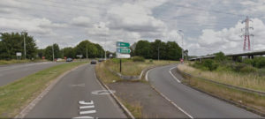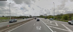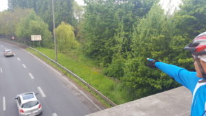 With cars merging from the right and horns blaring out the obvious to us we searched for options until a bridge appeared. We jumped behind the barrier next to the bridge and fought our way through the brambles and stinging nettles.