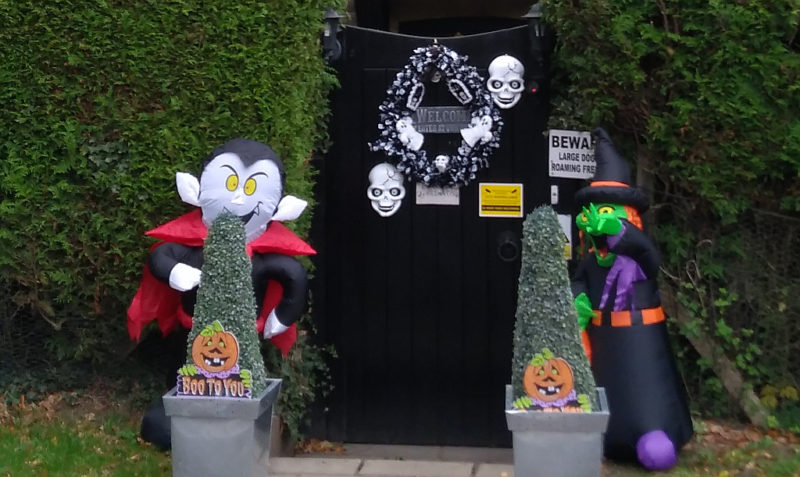 No competition as Barry had left Skippy at home. There was an impressive 15 or so heading up Portnalls behind TomTom on a long ride to a new destination near Faygate. A whizz down Reigate Hill and on the the road to Newdigate a reminder that Halloween is upcoming: