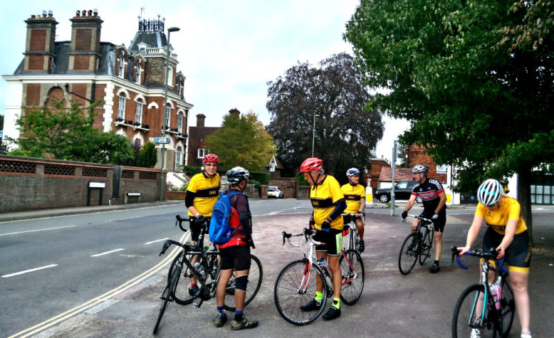 The ‘A’ Ride was back to normal after last week’s adventure. But not without a little excitement. The ‘A’ Ride has grown big enough to have to split in two when there is traffic about. Here in Leatheread the front mob are awaiting the back mob to catch up – only to find out that George had been clipped crossing the A24. And we are not talking SPDs. A sore foot but and an undamaged bike was thankfully the result.