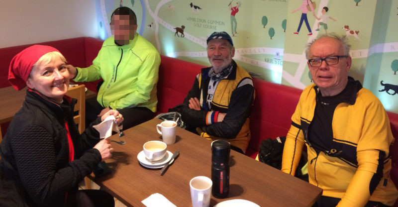 After briefly admiring Bob (the fireman)’s 28inch electrified mountain bike we set off, initially heading towards Croydon before we took back roads through to Sutton following bike route 77. Then we followed a series off road cycle paths that took us past the wetlands at The Hamptons, a couple of graffiti artists and on to Motspur Park. We continued through Raynes Park and Wimbledon Village to reach the Common and the Windmill Café. The Café was a most welcome chance to warm up and re-fuel.