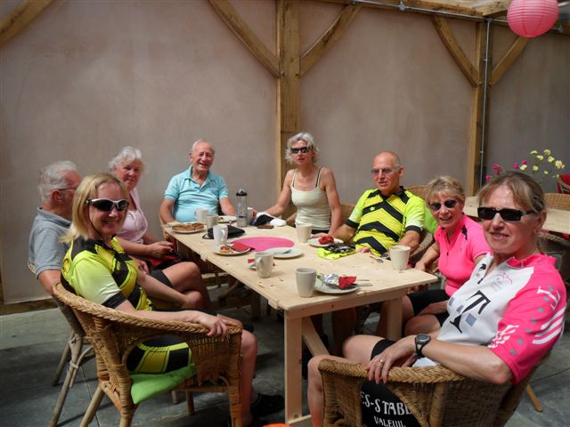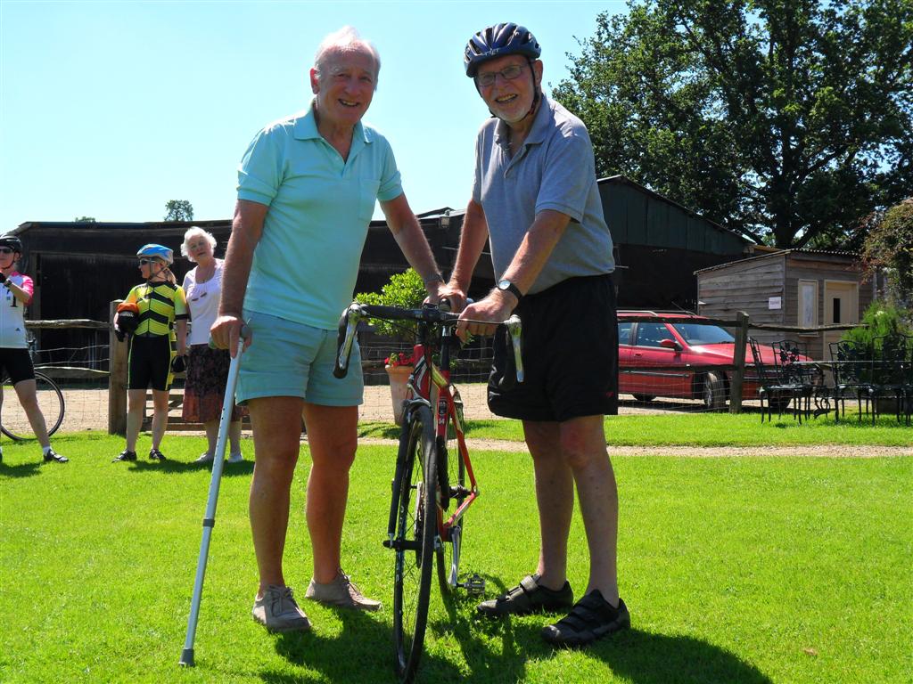 However, we were by no means the only cyclists sweating it out that day. Many riders (inspired by the upcoming Olympic road race, perhaps) were about, and some of them we met at the farm. One of these was Jim Trenowden, who was well known to John and Meike, as he and John had raced against each other years ago.  Jim was a member of the Addiscombe Club, and is still with them. At the impressive age of 86, he is still a keen rider, enjoying rides around the Surrey area south of Reigate Heath.