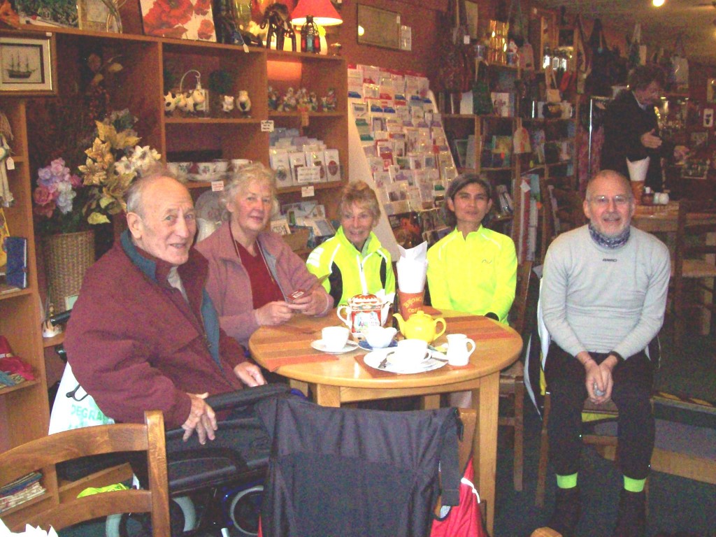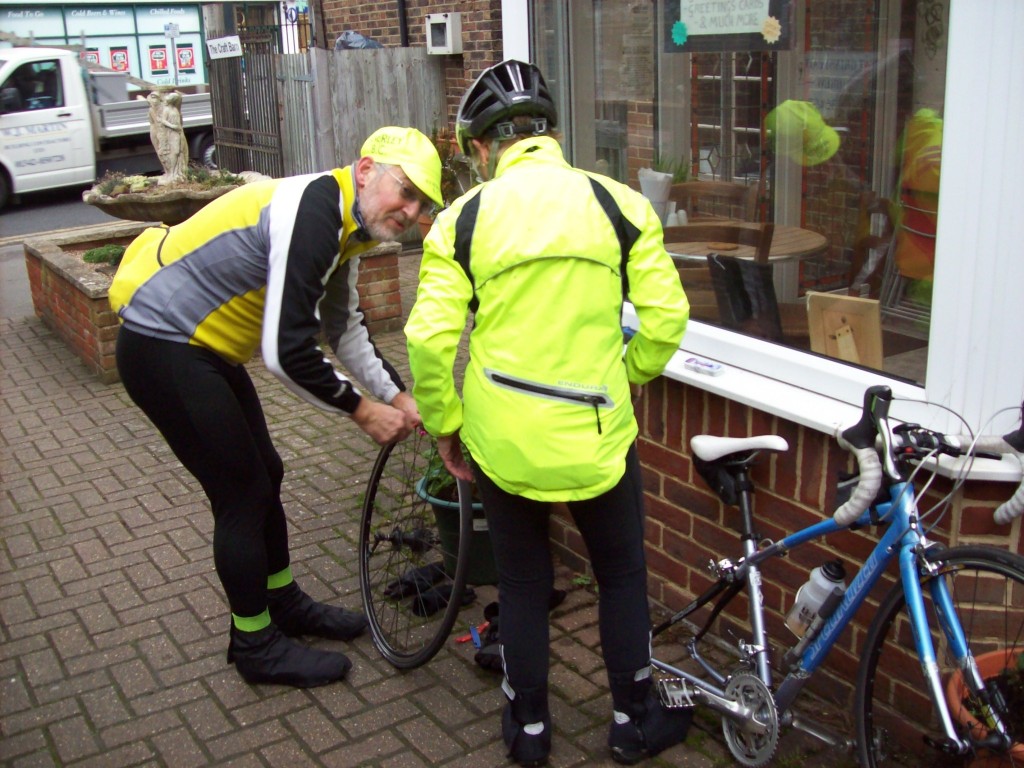 But this was not the end of John’s pneumatic drills. Ninety minutes and 15 miles further on it was Sandra’s turn to suffer the deflating effects of a slow puncture. She managed to get to our tea stop, where noble John came to the rescue of our damsel in distress and did another quick inner tube change. What a gent. Who said that chivalry was dead?