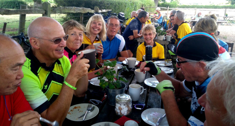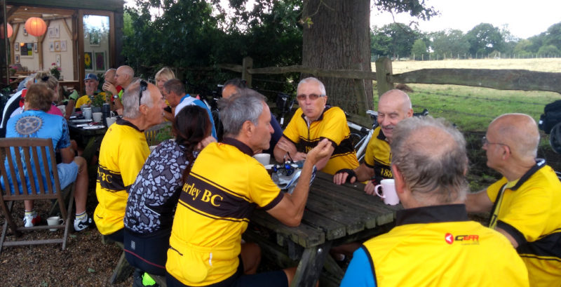 No ‘A’ ride so on a gorgeous hot day it was Pete R who led out a large ride to Tanhouse Farm. If you weren’t warm then up Portnall’s did the job. A puncture delayed our descent of Reigate Hill but otherwise an uneventful ride to the watering hole.