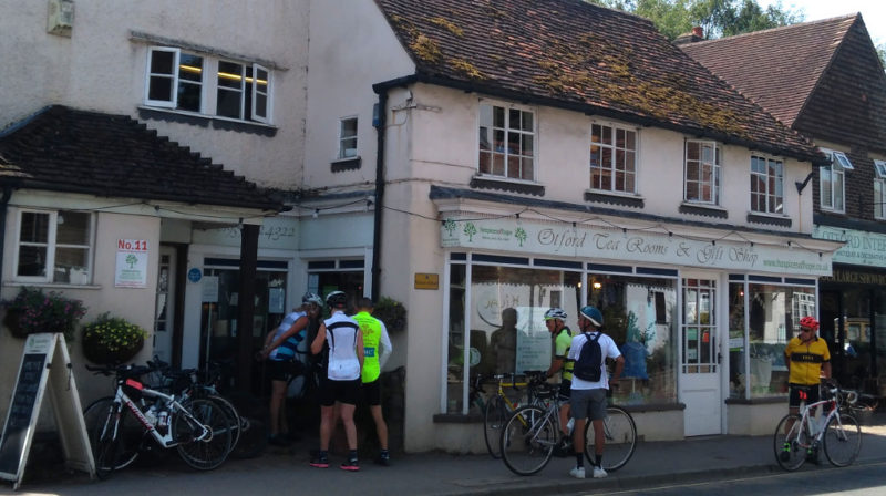 Fourteen, including newcomer Chris, set out behind John D on the ten o’clocker. Botley Hill, along Chestnut Avenue through Knockholt to Otford. There to meet that ‘A’ team who were just departing – but not from our destination – the Pond Café Otford. Apparently it was closed Monday/Tuesday. Luckily almost opposite is the Otford Tea [and Charity] shop. What a find! Besides be able to buy a lookalike Stradivarius for £25 there was cake and big pots of tea for not a lot.