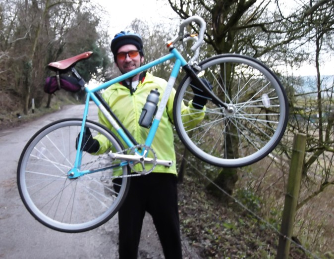 Although I had heard about Jeremy’s latest machine, I hadn’t seen it. So just to show how light his fixed wheel Viking, is, or perhaps just to show how fit he is, here is the proof!