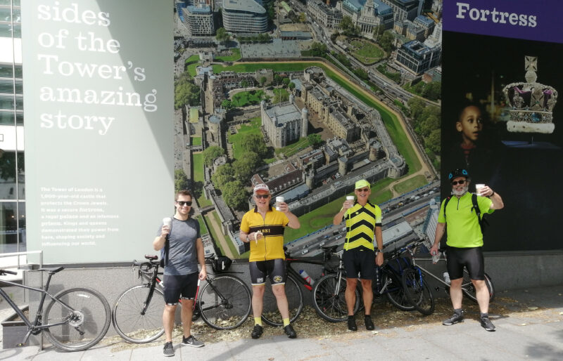 The Cutty Sark stood closed completely bereft of tourists. We push on along, mostly, the Thames Path and across Tower Bridge. Here we stopped for refreshment and the best picture of the deserted Tower we could find: