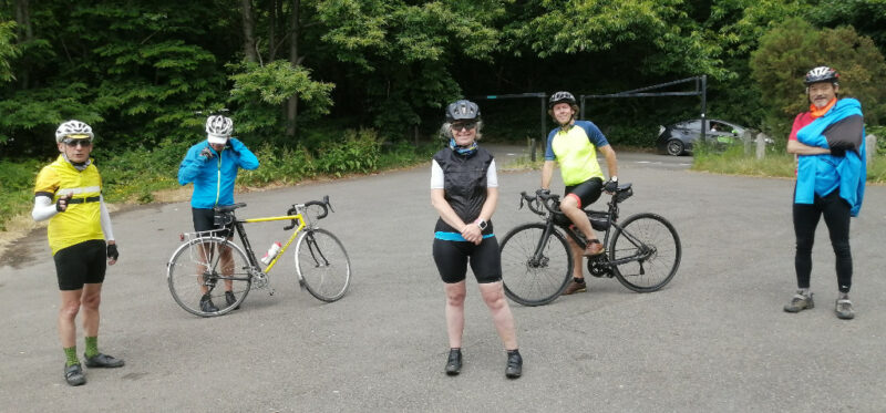 Next John Di with Jim K, Roger F, Vince H, and Robert H. We went through Sanderstead village (and past my old primary school for personal nostalgic reasons) and out along Limpsfield road to the top of Titsey, then down Clarks Lane until turning left onto the Pilgrims Way. This is a popular cycle route for good reason; vineyards on our right, great views, and rolling lanes with little other traffic. The route then took us down to Brasted followed by the 2 mile climb of Toys Hill – again, this appeared to be a very popular route choice! We had no use for the defibrillator or oxygen at the top, but we did regroup outside the Fox and Hounds pub (which is for sale as a residential property if anyone is interested). The hill up gave a marvellous downhill payback, although great care was required due to a couple of corners and a poor road surface. Heading towards Edenbridge we went through Four Elms and seeing an open shop selling coffee and cake I decided not to gamble on Edenbridge, so we stopped for a good coffee and chat, or possibly a good chat and coffee. We caught up on cycling experience under lockdown, and Vince was interested in getting feedback on the booking sheet. Well done for implementing so quickly!